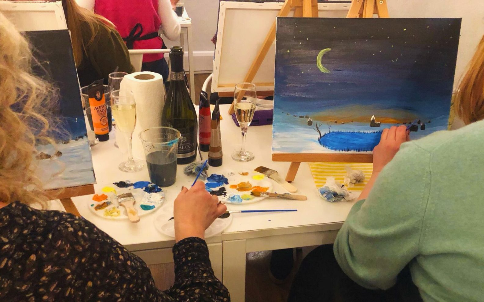 We’ll provide everything you need—paints, brushes, canvas, apron, and easel—plus a complimentary glass of prosecco or non-alcoholic alternative on arrival, and two additional drinks throughout the session. (*beer, wine, or soft drinks).